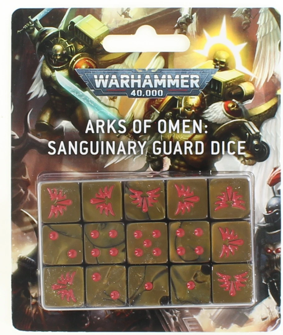 15 D6 dice Gold Swirl in color with red pips and a Blood Angels Symbol replacing the 6 side.