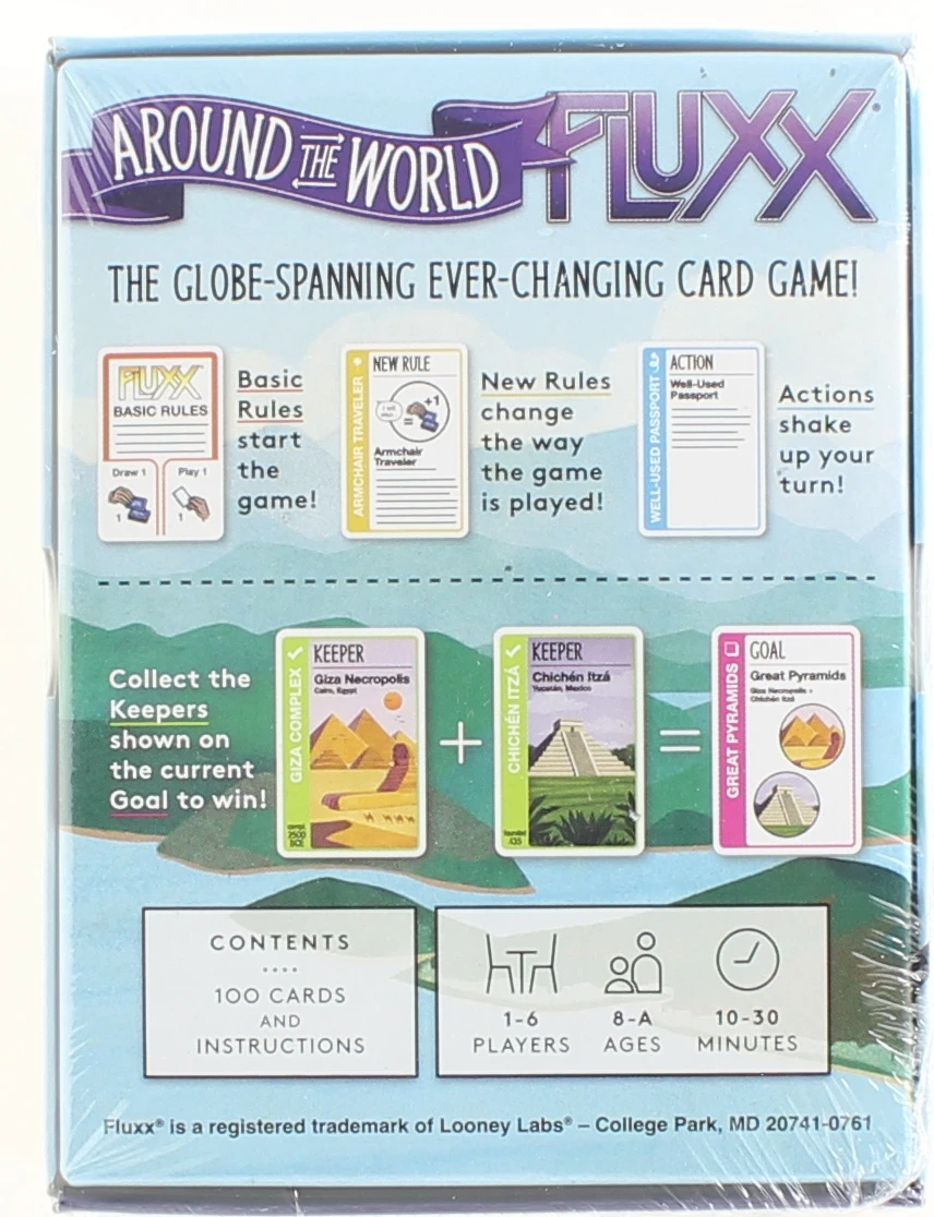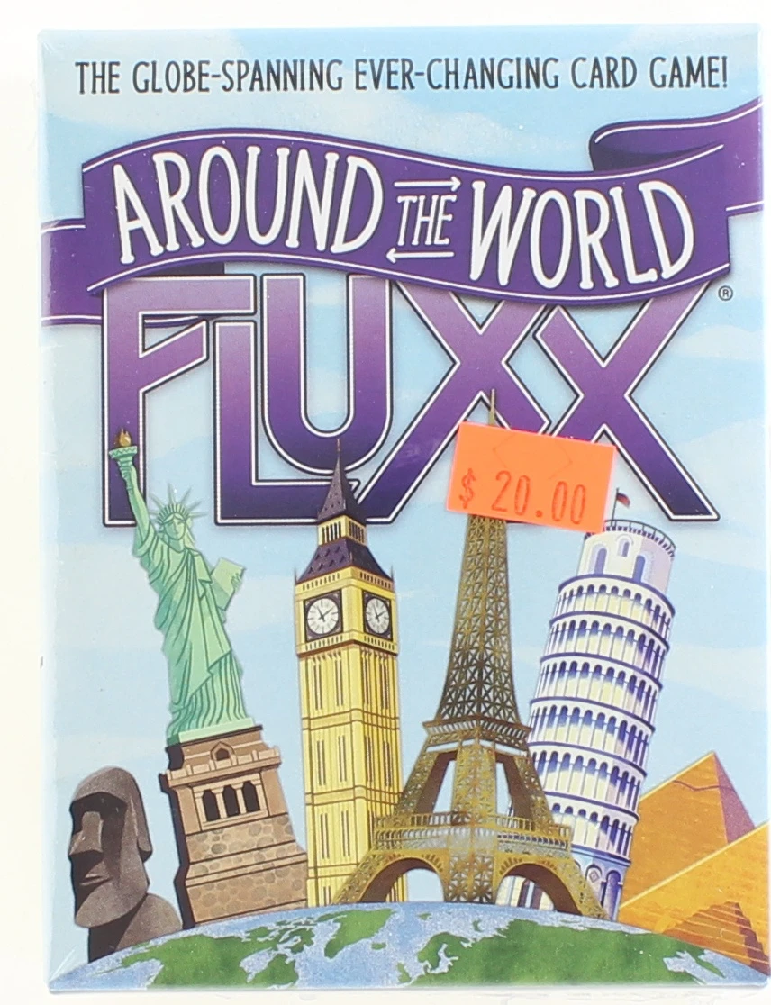 Fluxx is a card game in which the cards themselves determine the current rules of the game. By playing cards, you change numerous aspects of the game: how to draw cards, how to play cards, and even how to win.At the start of the game, each player holds three cards and on a turn a player draws one card, then plays one card. By playing cards, you can put new rules into play that change numerous aspects of the game: how many cards to draw or play, how many cards you can hold in hand or keep on the table in front of you, and (most importantly) how to win the game.Around the World Fluxx uses the basic gameplay of Fluxx, but now you’re on visiting famous landmarks around the globe. Discover man-made wonders across all seven continents, from Stonehenge to the Taj Mahal, including the Galápagos Islands, Panama Canal, Angkor Wat, and the Statue of Liberty.