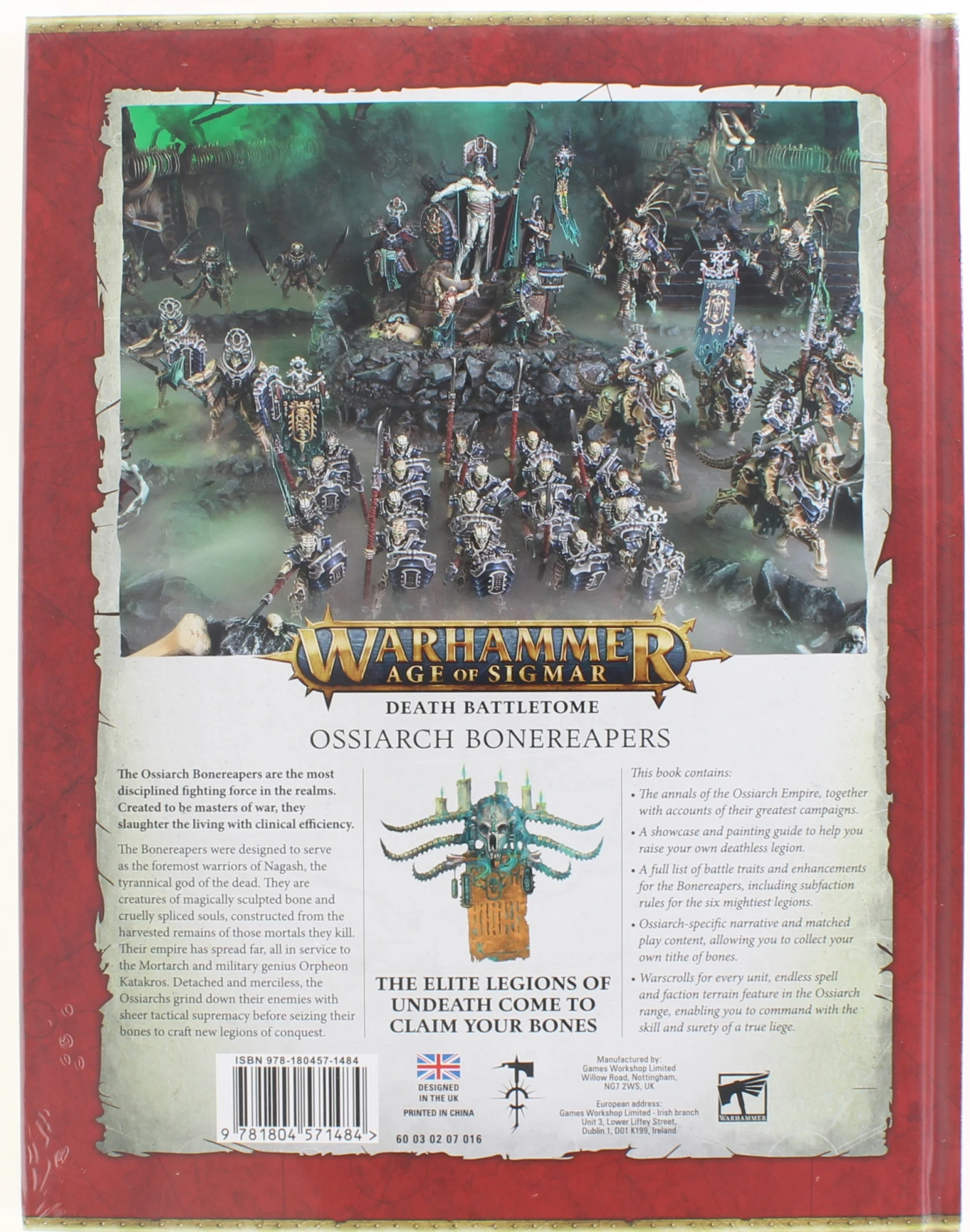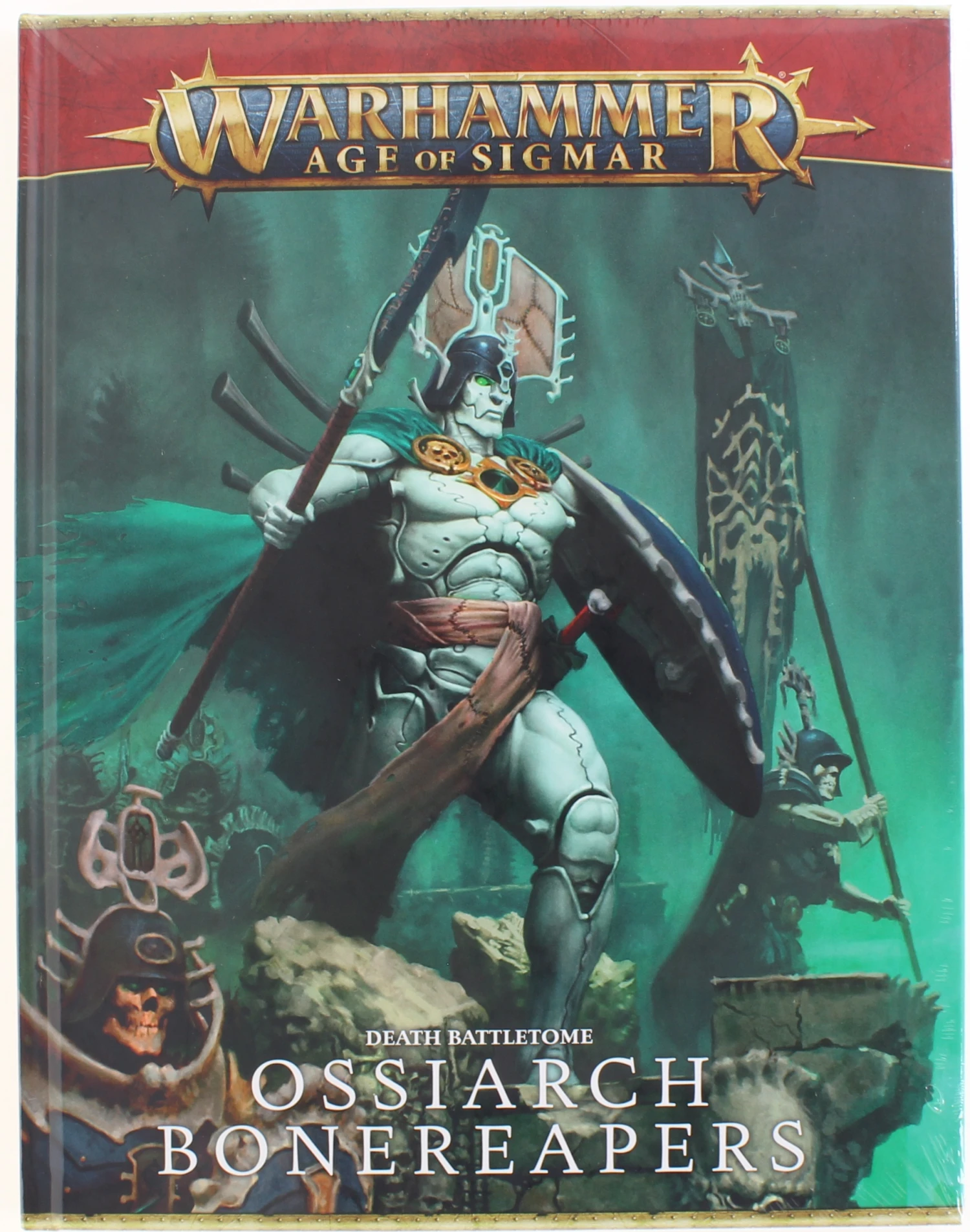 The Ossiarch Bonereapers are a faction of undead warriors in the Age of Sigmar who serve the god of death, Nagash. These bone constructs are created from the shattered remains of the strongest mortal warriors who have fallen in battle, and have been re-forged into unyielding and relentless soldiers. In this Battletome you will find Lore, Artwork, and all the Rules needed to play your Ossiarch Bonereapers Army.