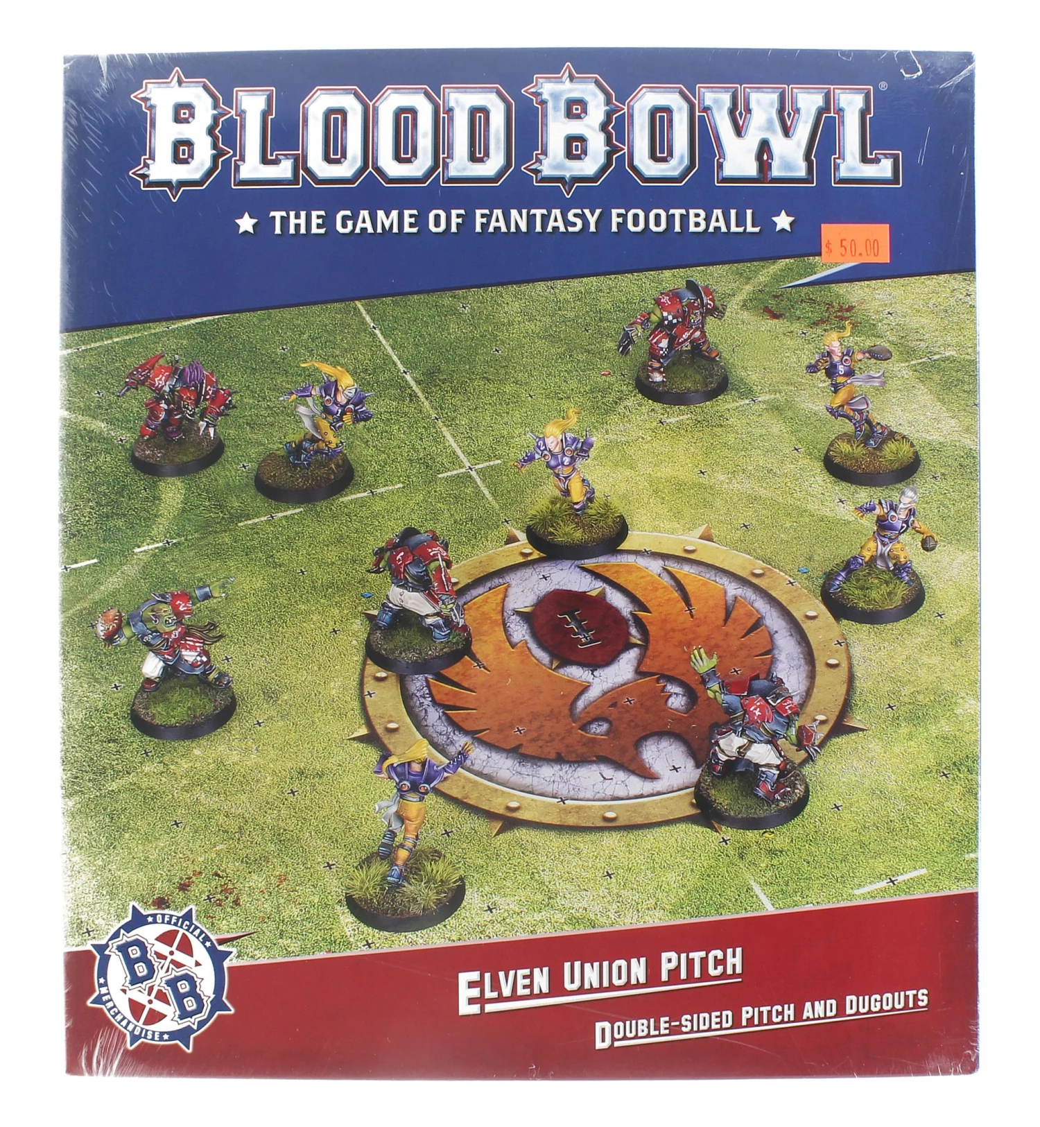 A double-sided Blood Bowl pitch and dugouts set with bespoke artwork unique to Elven Union Teams. Rules for using the pitch in your games of Blood Bowl are printed on the back of the box. Rules for using the pitch in your games of Blood Bowl are printed on the back of the box.