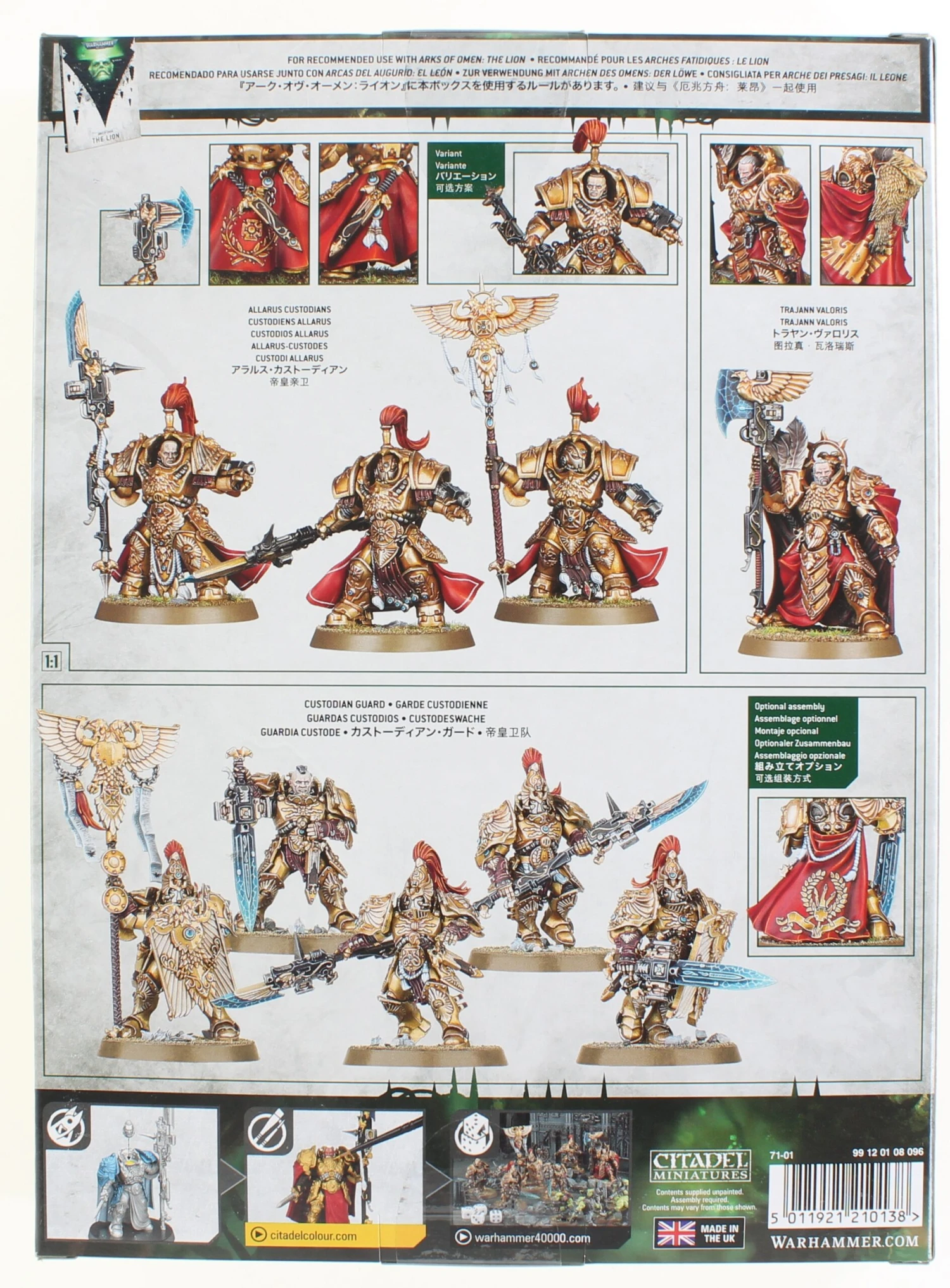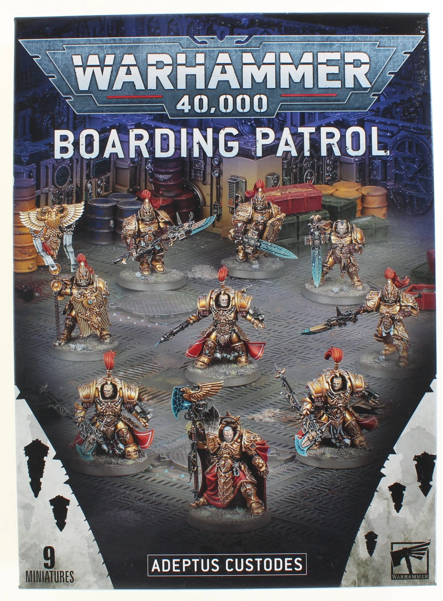 Boarding Patrol is a newer Warhammer 40k game type featured in 9th Edition. Its features smaller army lists at no more than 500 points and specific units from specific roles. The gameplay is typically in close quarters as the narrative of the game type is set thematically on various space ships in the 40k universe. This means rather than buildings and ruins there will be hallways and corridors. Boarding Patrol provides a refreshing change up in the current 9th edition play style! This box features the Adeptus Custodes including 3 Allarus Custodians, 5 Custodian Guard, and Trajann Valoris.