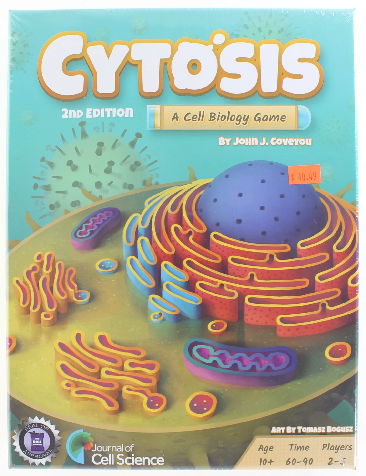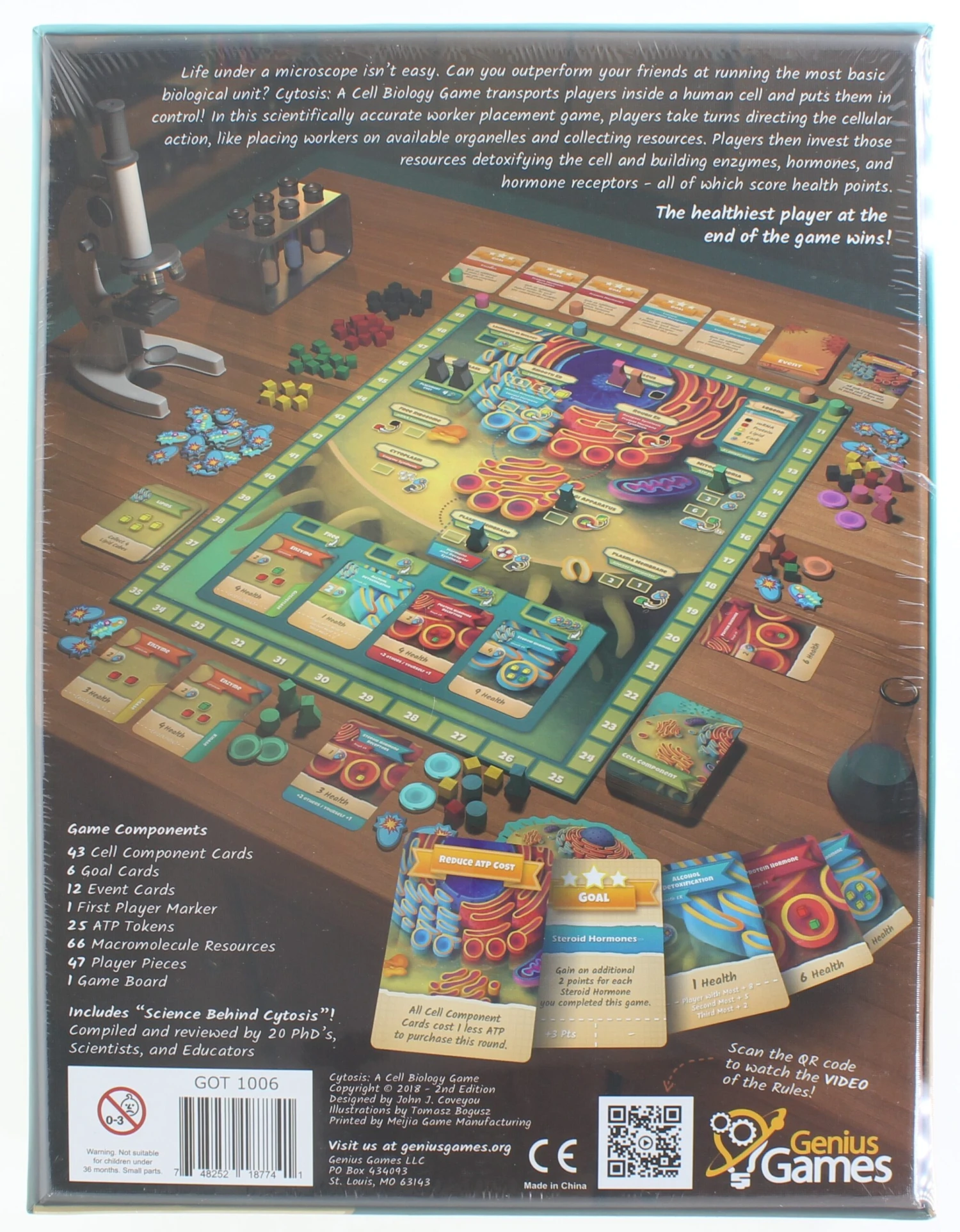 Cytosis: A Cell Biology Game, is a worker placement game that takes place inside a human cell! Players take turns placing workers on available organelles within a human cell in order to collect resources (such as Carbohydrates or ATP!) or take actions (such as purchasing Cell Component cards or translating mRNA into Proteins!)Players use their resources to build Enzymes, Hormones, and Hormone Receptors and also to help detoxify the cell – all of which score health points. The player with the most health points at the end of the game wins!