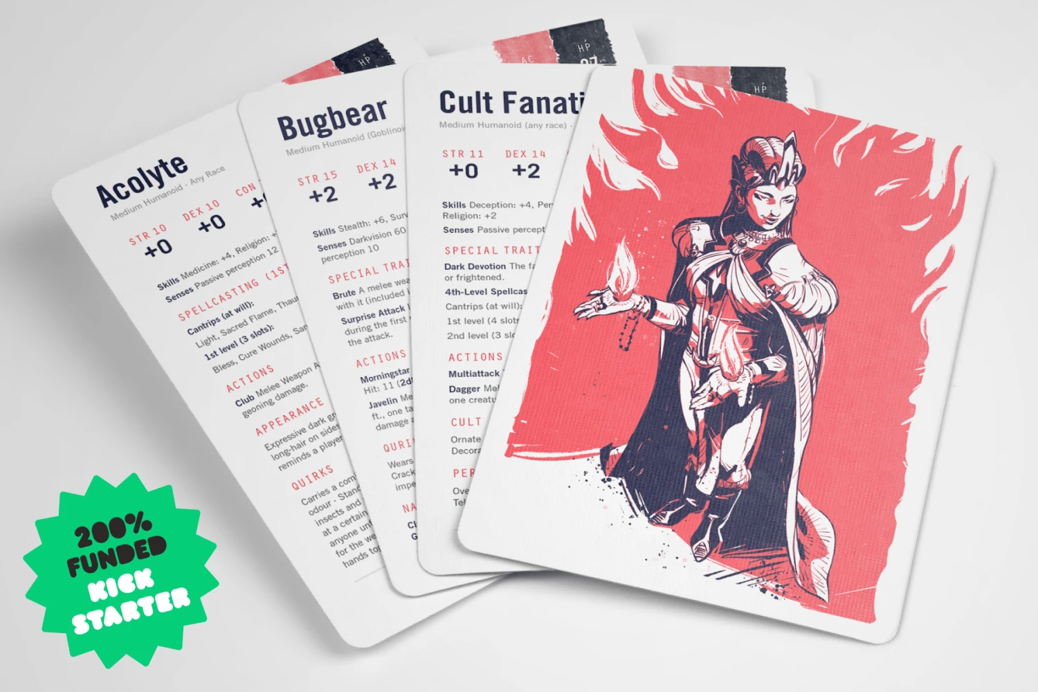Monster Cards is a deck of of 70 large-format cards to reference creature statistics in DnD 5th edition. If you missed our Kickstarter Campaign now is your chance to be included in the 2020 print run.