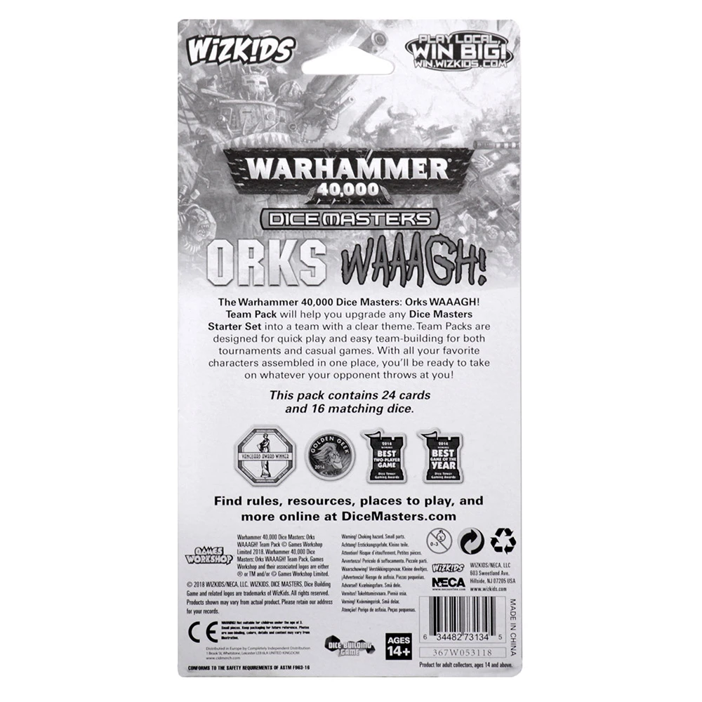 The Warhammer 40,000 Dice Masters: Orks – WAAAGH! Team Pack will let players build their own team of Orks! This team pack is perfect for the Dice Masters veteran or someone looking to jump into the game fresh! This team pack can be paired with the Warhammer 40,000 Dice Masters: Battle for Ultramar Campaign Box to give a player everything they need to build a highly focused team for thematic play! With 3 different versions of each character, there are HUNDREDS of team building combinations!
