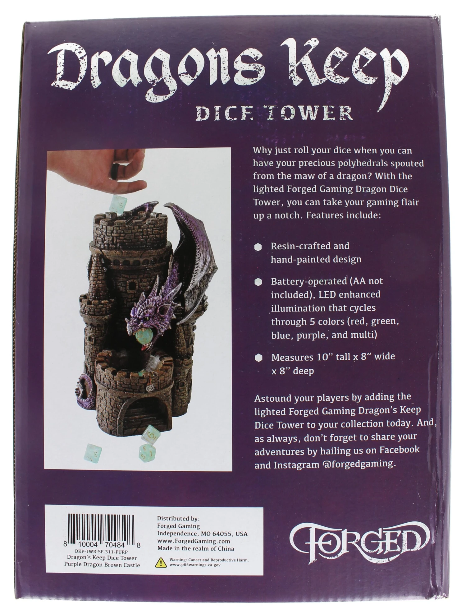 Test your fate with the expertly crafted Dragons Keep resin dice tower! Measuring 10 inches tall, 6 inches wide, and 8 inches deep (front to back), this tower makes an awesome environmental piece for any RPG adventure. Standard-sized polyhedral dice enter the top of the tower, exit the dragon’s mouth, and out the onto the table through the lower tower. This dice tower is made over 3 lbs. of from durable, high quality poly-resin. The LED light embedded in the lower tower cycles through 5 colors to add ominous flair to your next gaming session. NOTE: Batteries not included. Requires 2 AA batteries (not included).