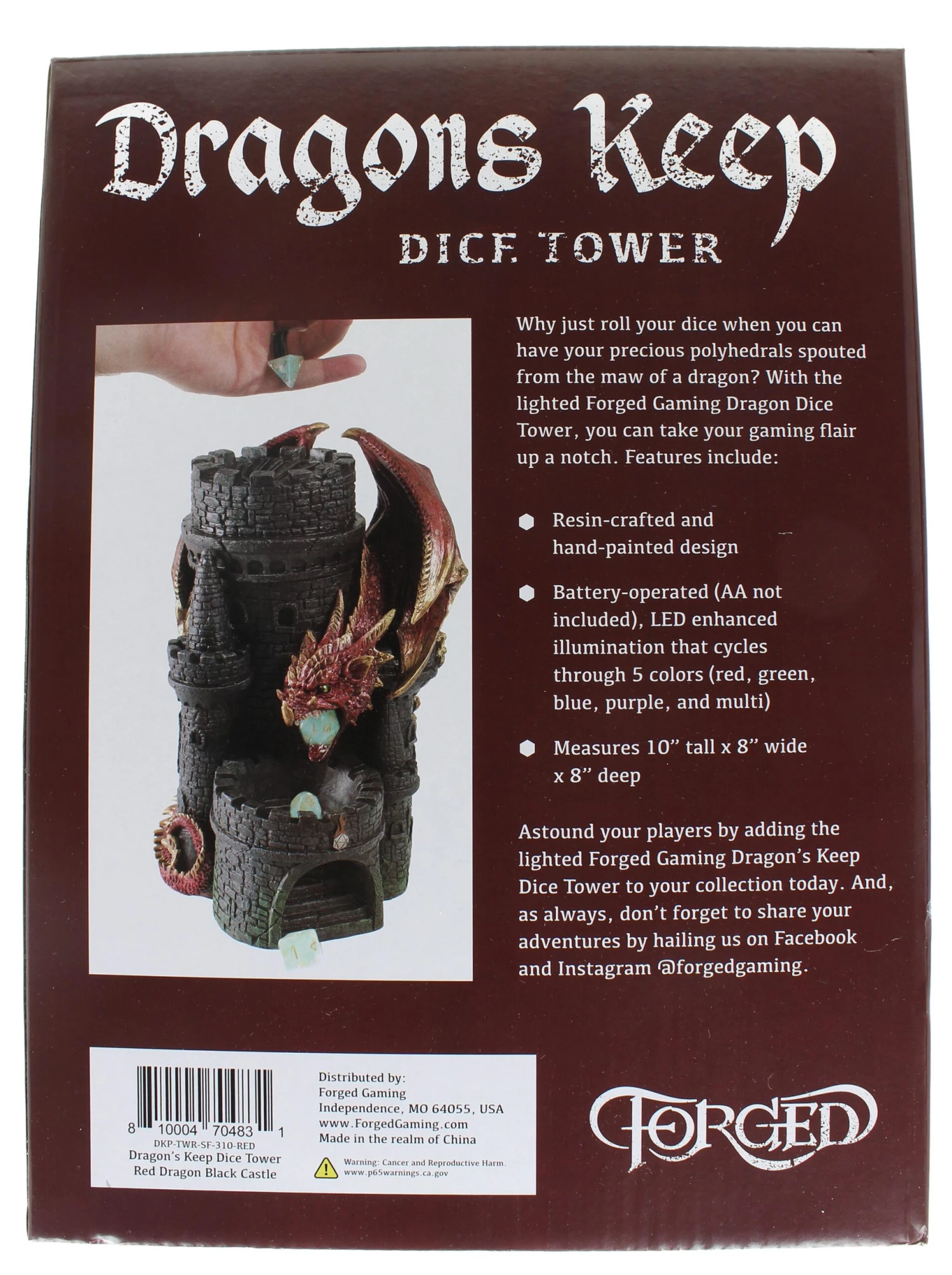 Test your fate with the expertly crafted Dragons Keep resin dice tower! Measuring 10 inches tall, 6 inches wide, and 8 inches deep (front to back), this tower makes an awesome environmental piece for any RPG adventure. Standard-sized polyhedral dice enter the top of the tower, exit the dragon’s mouth, and out the onto the table through the lower tower. This dice tower is made over 3 lbs. of from durable, high quality poly-resin. The LED light embedded in the lower tower cycles through 5 colors to add ominous flair to your next gaming session. NOTE: Batteries not included. Requires 2 AA batteries (not included).