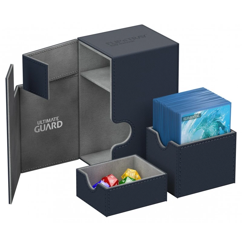 Premium XenoSkin card box with magnetic closure and card and dice trays for the protection and archival safe storage of double-sleeved cards in standard size.