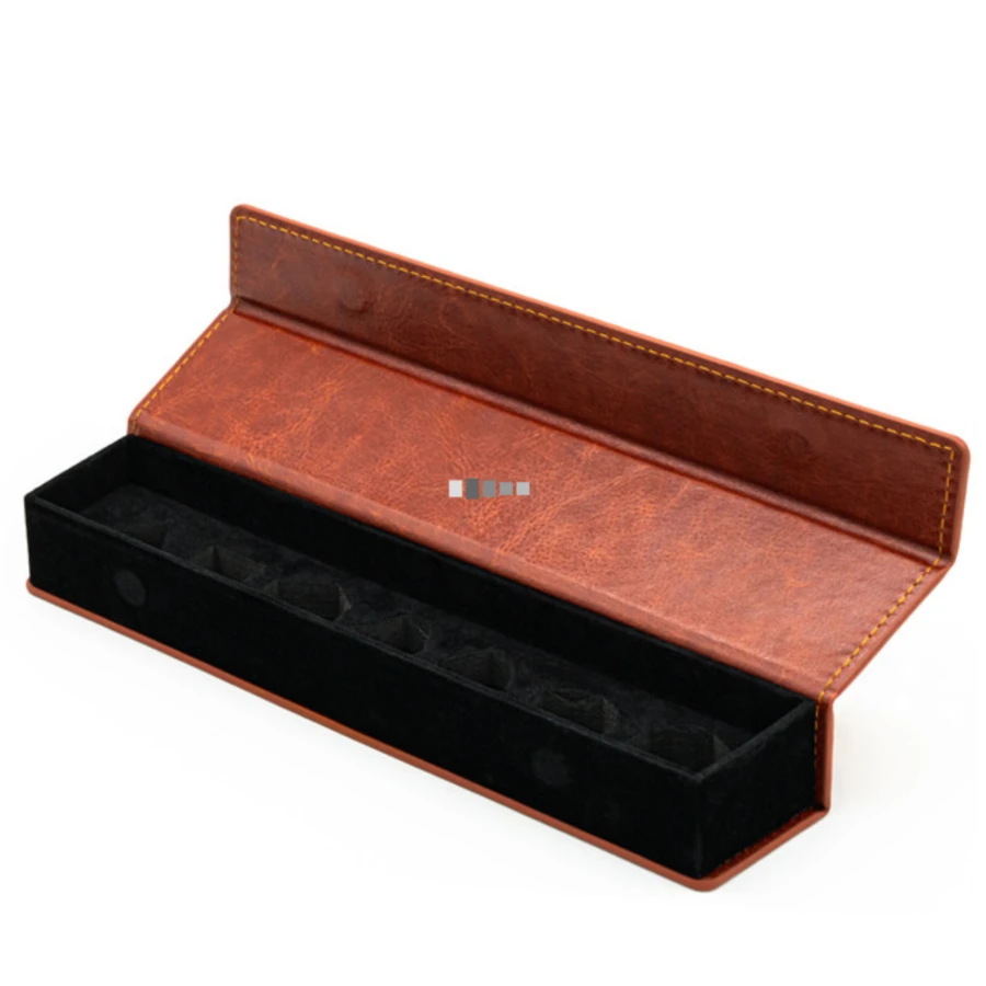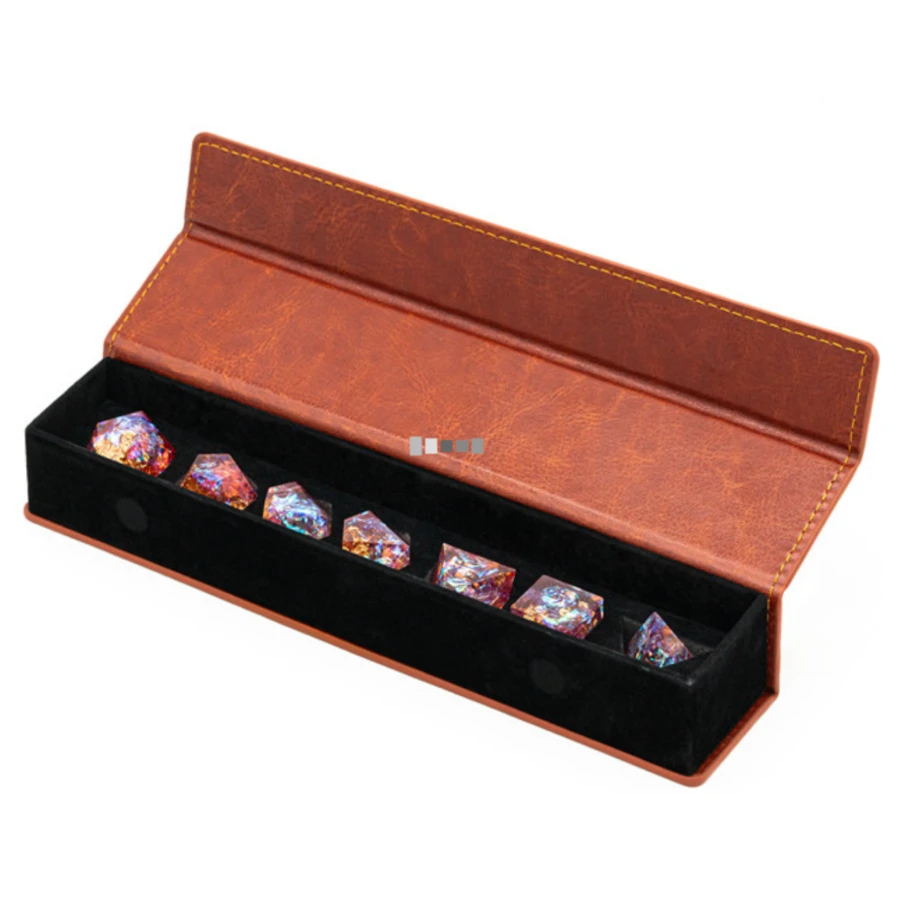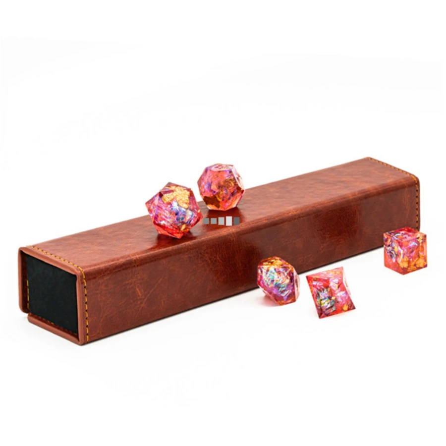 This Dice Box has a foam insert with cutouts for your dice and is extra deep for those extra large dice, especially sharp edged dice. There are strong magnets holding the box closed and a leather-like exterior.