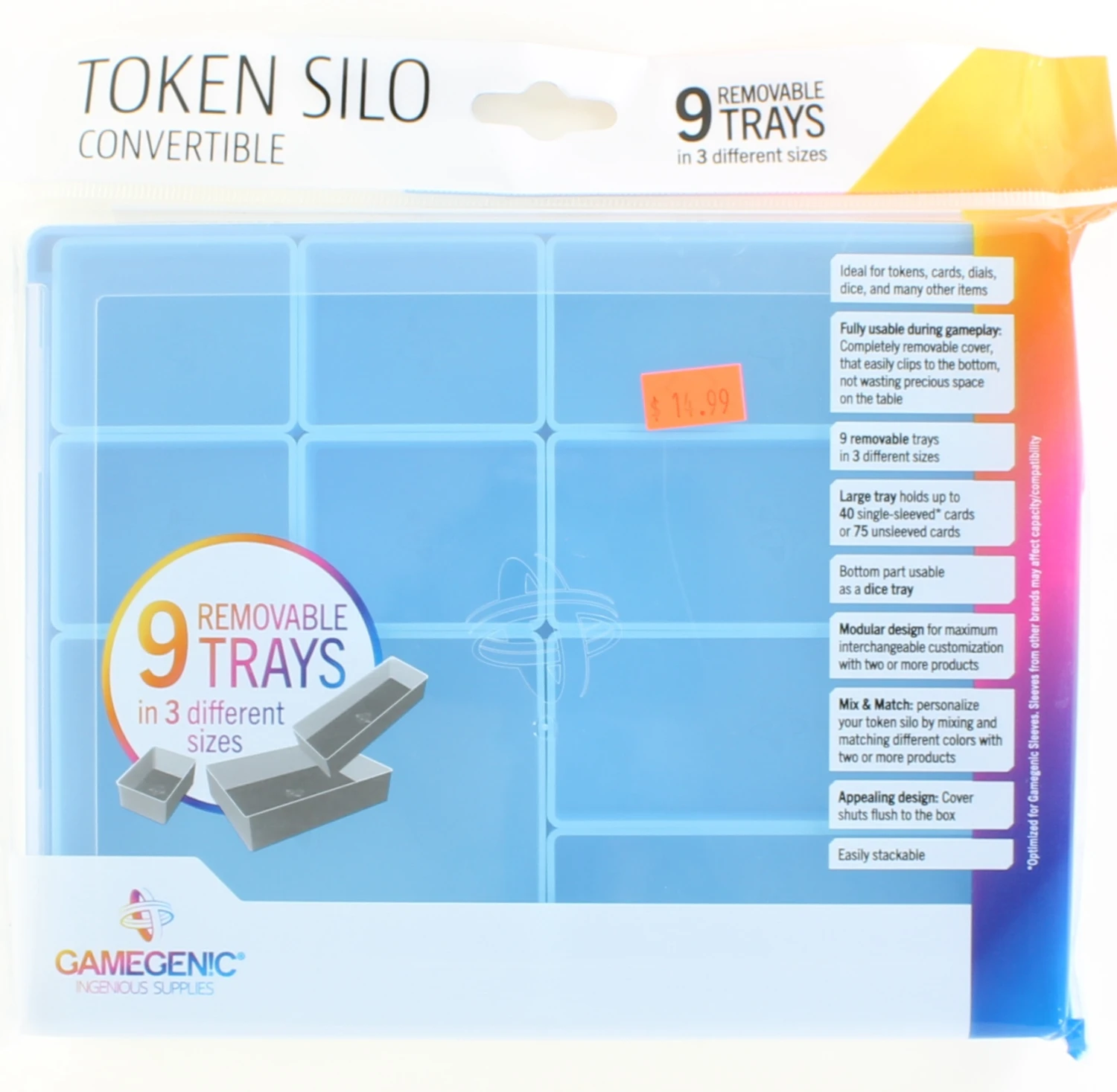 Save precious space on your board game table with our revolutionary, convertible, Token Silo. Just clip the cover to the bottom of the box for easy access to all your tokens. This unique, convertible box stores and organizes a variety of tokens, cards, dials, dice, and many other items. The Token Silo comes with 9 trays in 3 different sizes, that are fully removable to keep your accessories handy during the game. The boxes can be stacked several times and are made of durable, robust material. It is available in several vibrant colors which can be mixed and matched.