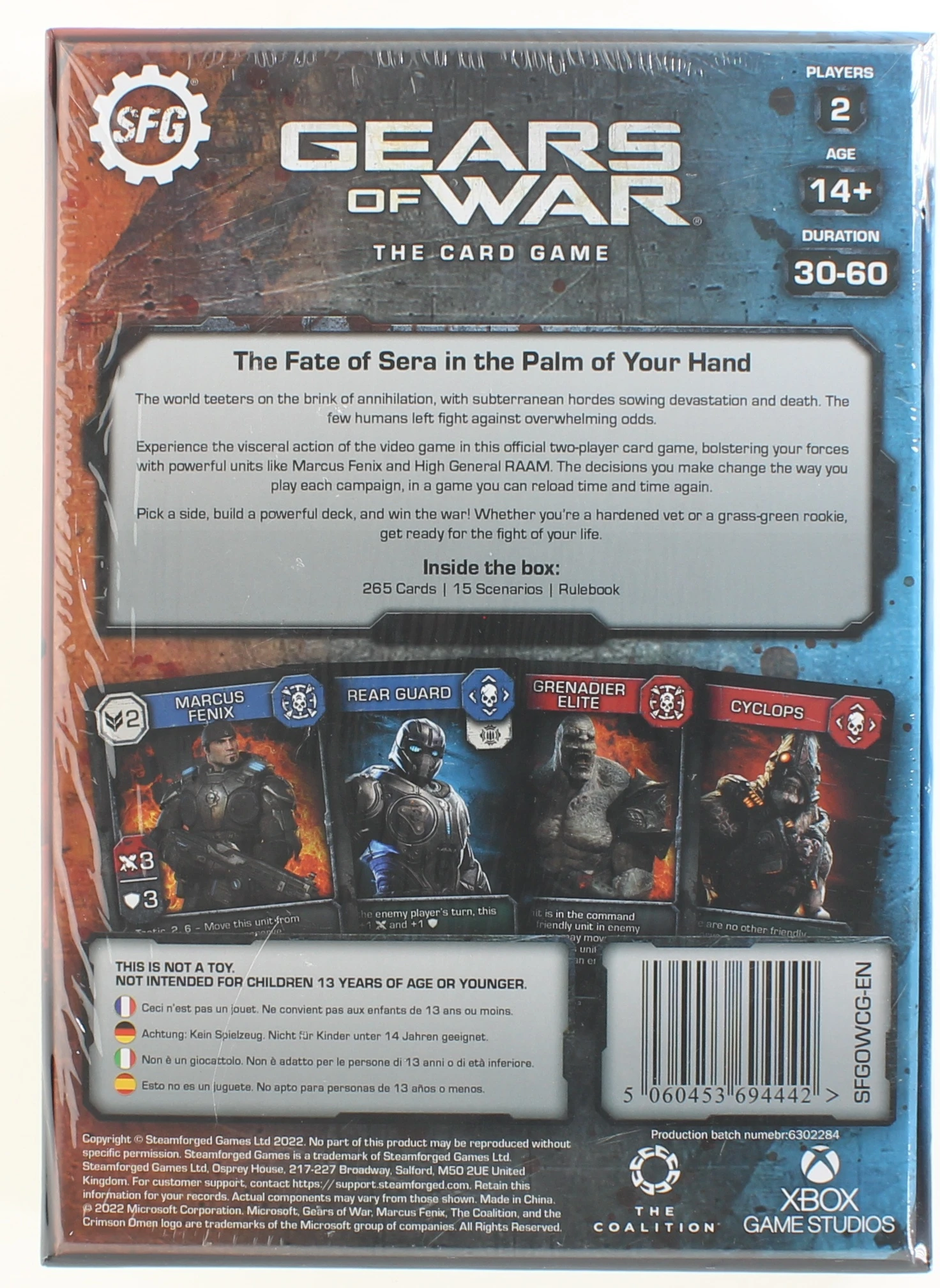 Listen up, soldier. The world is in ruin. The Locust Horde has risen. Its Human vs Horde, and heres your mission: Pick a side, build a powerful deck, and win the war. The fate of the world is in your hands! Experience the gritty gunplay of the video game in this official two-player card game. Take command of the COG forces or the Locust horde and seize control of the battlefield, one chapter at a time.Strategise your way through each chapter, bolstering your forces with classic characters like Marcus Fenix, General Raam, August Cole Train Cole, Dominic Santiago, and Damon Baird.Every battle counts. Whatever happens in each chapter will change what comes next, so youd better be ready to dominate. The deck you build and decisions you make will change the way you play each campaign, making this a game you can reload time and time again. Whether you’re a hardened vet or a grass-green rookie, get ready to take cover and lay down suppressive fire. Your enemies are trying to take the line, soldier. Youd better shove back hard.