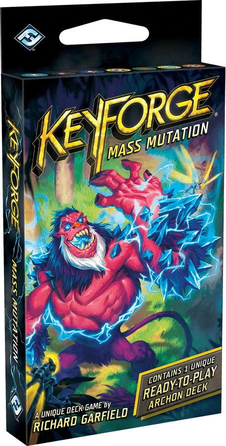 Change is coming to the Crucible with the Mass Mutation set for the world’s only Unique Deck Game, KeyForge. Over 200 brand-new cards now enter the cardpool in the game’s fourth set, and the mutative power of the dark æmber has changed many of them, creating strange and unknown versions of once-familiar creatures. As gigantic creatures stretching across two cards lumber their way into battle, and House Sanctum makes its triumphant return, there has never been a more impactful time to leap into the fast-paced duels of KeyForge.
