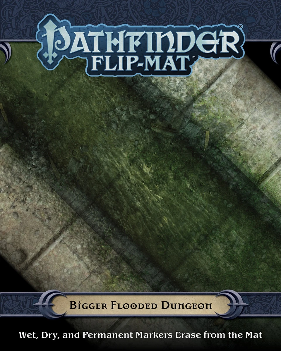 Pathfinder Flip-Mat: Bigger Flooded Dungeon measures 27 by 39 inches, which gives you 45% more gaming space than the standard Pathfinder Flip-Mat. On tabletops across the world, the Flip-Mat Revolution is changing the way players run their fantasy roleplaying games! Why take the time to sketch out ugly scenery on a smudgy plastic mat when dynamic encounters and easy cleanup is just a Flip away?