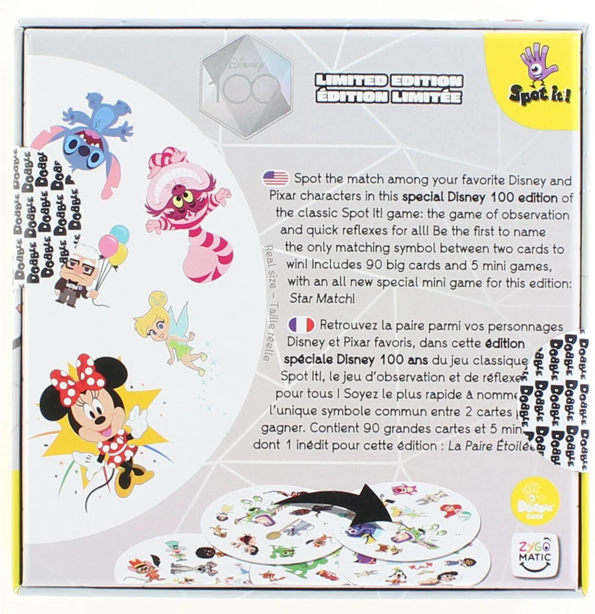 Spot the match among your favorite Disney and Pixar characters in this special Disney 100 edition of the classic Spot It! Game: the game of observation and quick reflexes for all ages! Be the first to name the only matching symbol between two cards to win! Includes 90 big cards and 5 mini games.