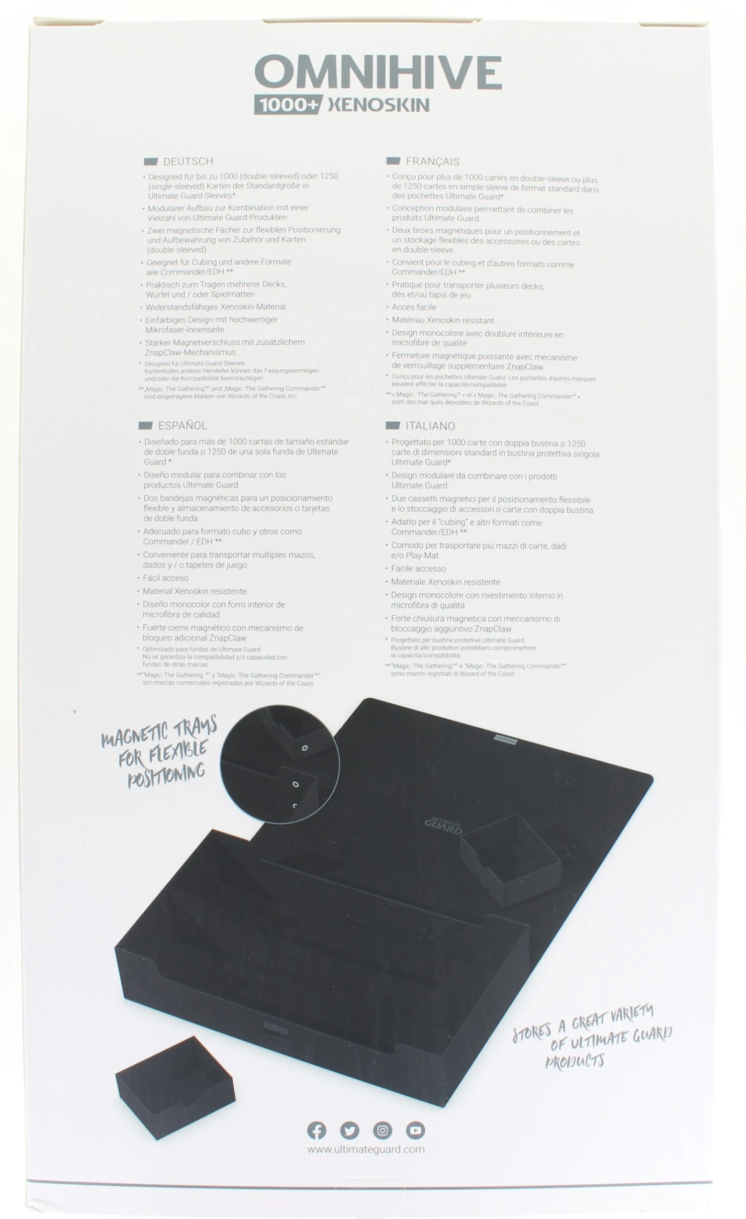 The ultimate spacious and flexible box for storing large collections. This box can hold more than 1000 double- sleeved cards or carry multiple decks and/or Play-Mats plus other Ultimate Guard products like the Sidewinder 133+. Two removable, magnetic, adjustable and stackable trays make this box unique: its adaptable for all kinds of games and formats and enables multiple different ways of storing and using your collection.
