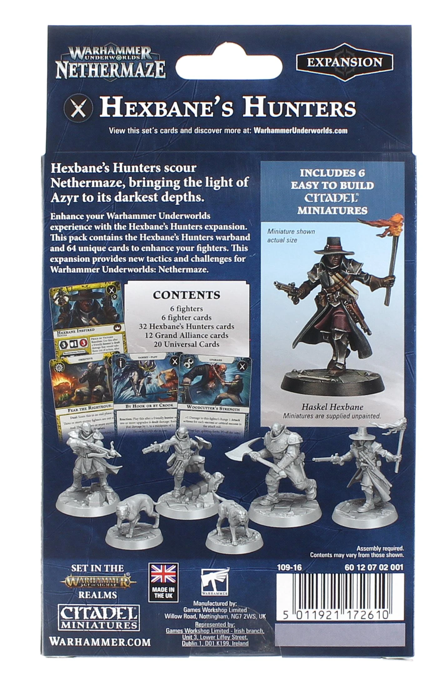 An aggressive yet fragile Warband for Warhammer Underworlds. Contains 6 push-fit miniatures of Hexbane’s Hunters in pre-coloured plastic. Includes 32 Hexbane’s Hunters cards as well as 20 Universal Cards and 12 Grand Alliance Cards that are usable with existing Underworlds Warbands.